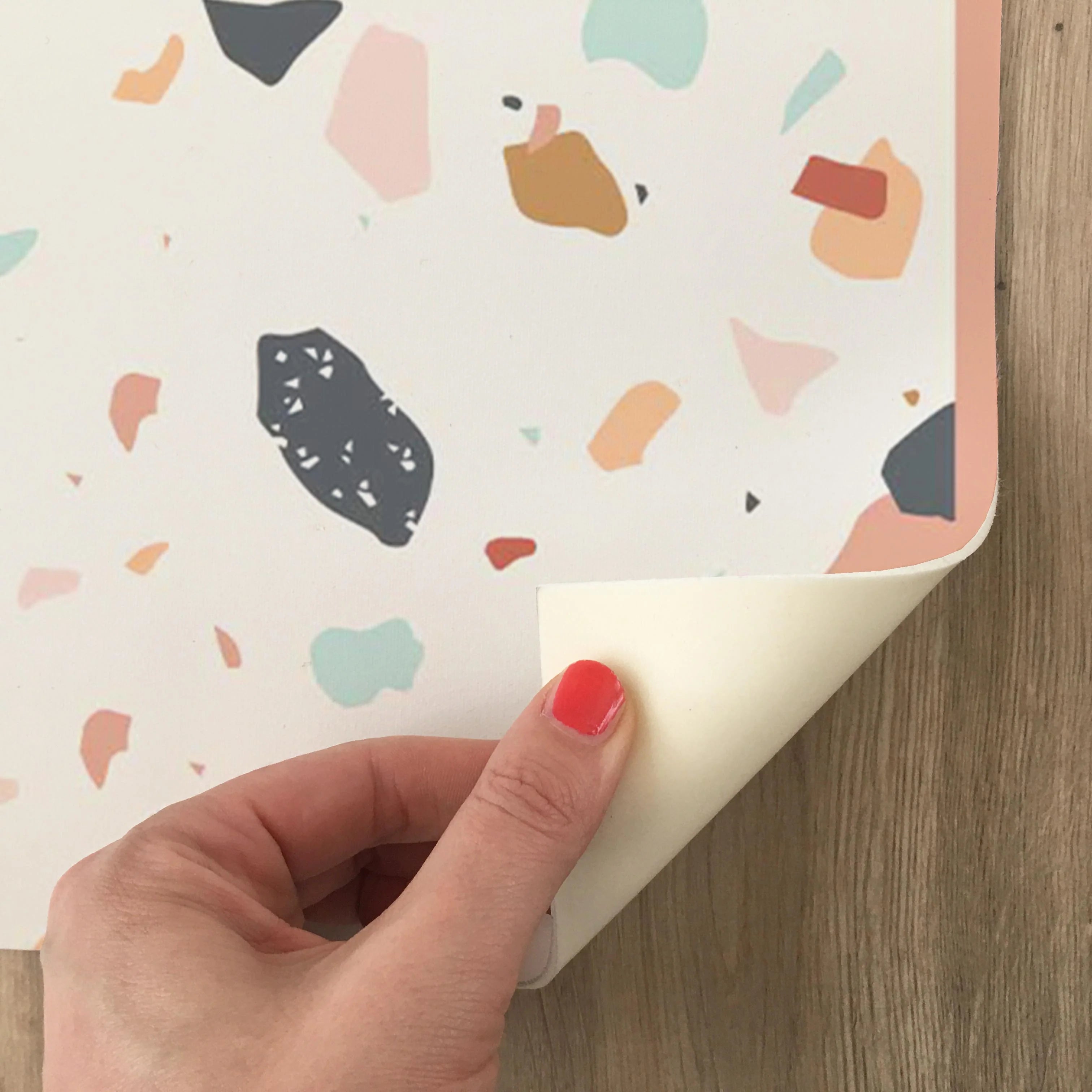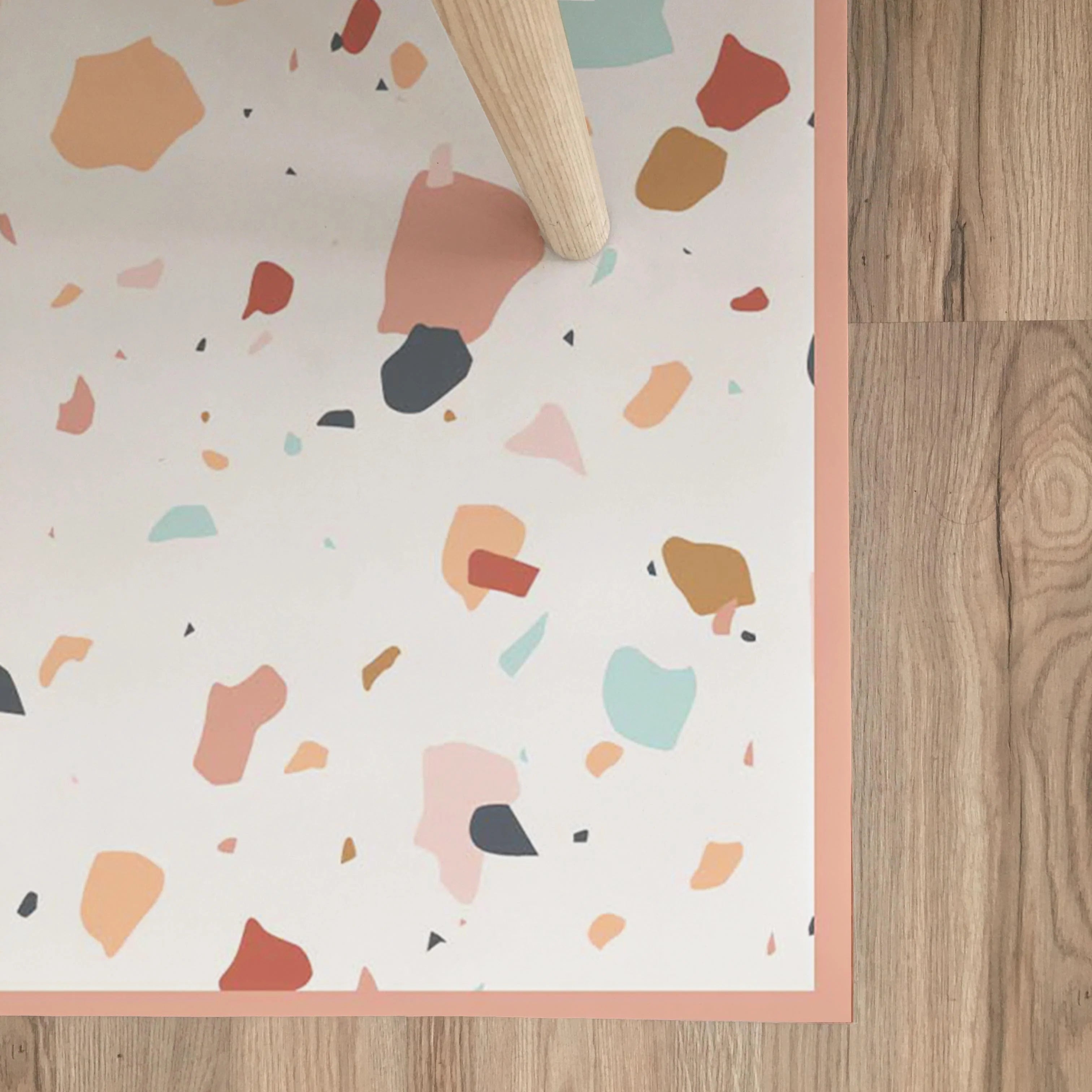 Materiale: Pvc di alta qualità con un leggero effetto a buccia d'arancia. Stampato con tecnologia UV. La superficie goffrata lo rende antiscivolo ( certificato R10 ) mentre il fondo morbido ne evita lo scivolamento sul pavimento. Certificato ignifugo Bfl-s1.