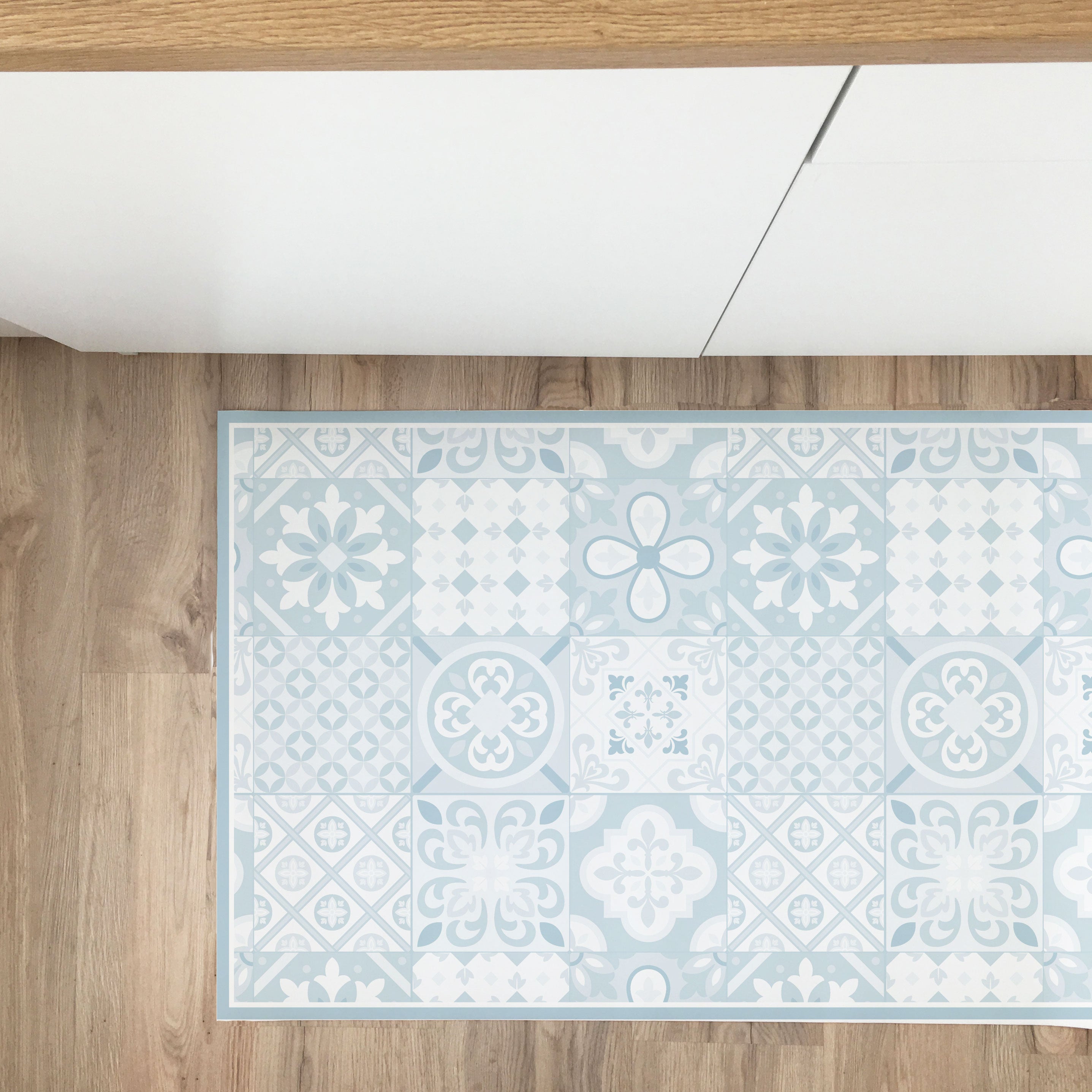 Materiale: Pvc di alta qualità con un leggero effetto a buccia d'arancia. Stampato con tecnologia UV. La superficie goffrata lo rende antiscivolo ( certificato R10 ) mentre il fondo morbido ne evita lo scivolamento sul pavimento. Certificato ignifugo Bfl-s1.